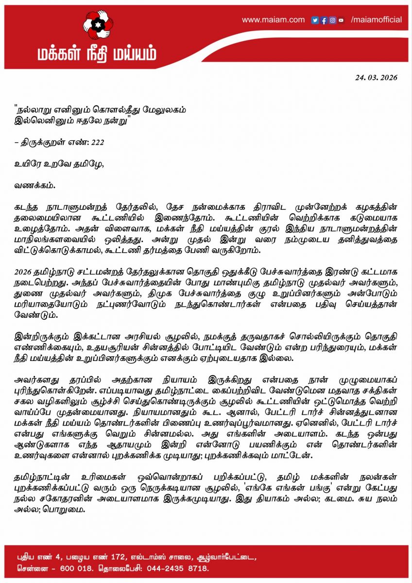 தமிழக அரசியலில் முக்கியமான மாற்றமாக, மக்கள் நீதி மய்யம் கட்சி தனது 2026 சட்டமன்றத் தேர்தல் குறித்த நிலைப்பாட்டை அதிகாரப்பூர்வமாக அறிவித்துள்ளது. கட்சியின் அடையாளமான பேட்டரி டார்ச் சின்னத்தில் போட்டியிடுவது குறித்து ஆலோசனை நடந்தபோதிலும், இந்தத் தேர்தலில் நேரடியாக போட்டியிடாது என ஒருமித்த முடிவு எடுக்கப்பட்டுள்ளது.