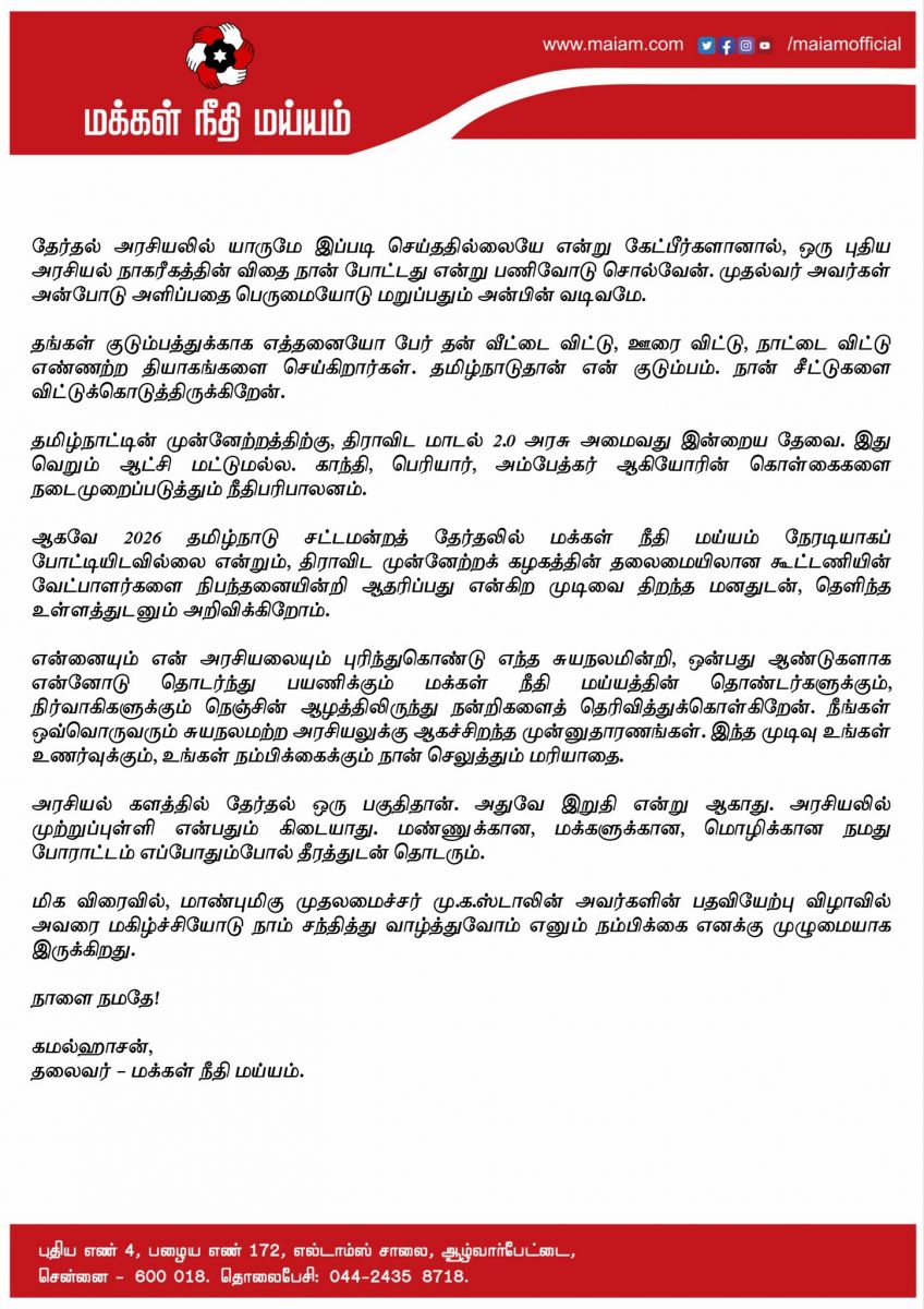 கட்சியின் அறிவிப்பின் படி, வரும் 2026 தமிழ்நாடு சட்டமன்றத் தேர்தல்-இல் மக்கள் நீதி மய்யம் தன்னிச்சையாகப் போட்டியிடாமல், திராவிட முன்னேற்றக் கழகம் தலைமையிலான கூட்டணியின் வேட்பாளர்களுக்கு நிபந்தனையற்ற ஆதரவை வழங்கும். இந்த முடிவு தமிழக மக்களின் வளர்ச்சியையும், மதவாத அரசியல் சூழ்ச்சிகளுக்கு எதிரான விழிப்புணர்வையும் முன்னிறுத்துவதாகக் கட்சி தெரிவித்துள்ளது.
