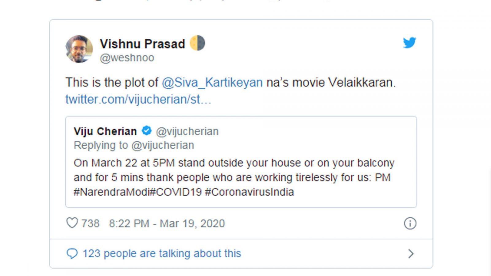 இந்த விஷயம் மோகன் ராஜா இயக்கத்தில் சிவகார்த்திகேயன் நடித்திருந்த 'வேலைக்காரன்' பட காட்சியுடன் ஒத்துப்போவதாக சமூகவலைதள வாசி ஒருவர் குறிப்பிட்டுள்ளார். வேலைக்காரன் படத்தில் மக்கள் தங்கள் ஆதரவை தெரிவிக்க, இரவு 12 மணிக்கு எல்லோர் வீட்டு லைட்டையும் போட சொல்லுவார். தற்போது மோடி பேசியதும் அவ்வாறு உள்ளதாக அந்த பதிவில் குறிப்பிட்டுள்ளார்.