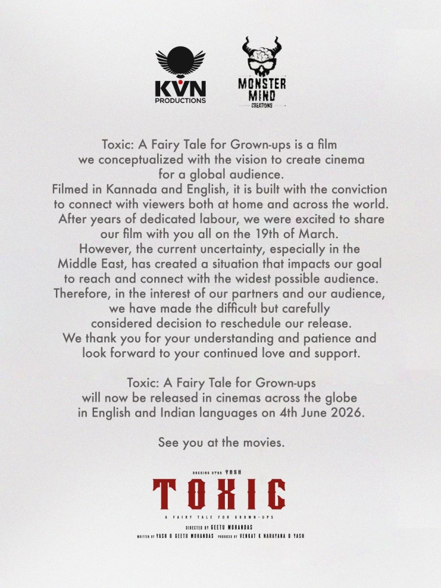 மிகவும் எதிர்பார்க்கப்பட்ட ஆக்ஷன்-டிராமா திரைப்படமான ‘டாக்ஸிக்: எ ஃபேரி டேல் ஃபார் கிரோன்-அப்ஸ்’ (Toxic: A Fairy Tale for Grown-Ups) வெளியீட்டு தேதி மாற்றப்பட்டுள்ளதாக தயாரிப்பு நிறுவனங்கள் KVN Productions மற்றும் Monster Mind Creations அதிகாரப்பூர்வமாக அறிவித்துள்ளன.