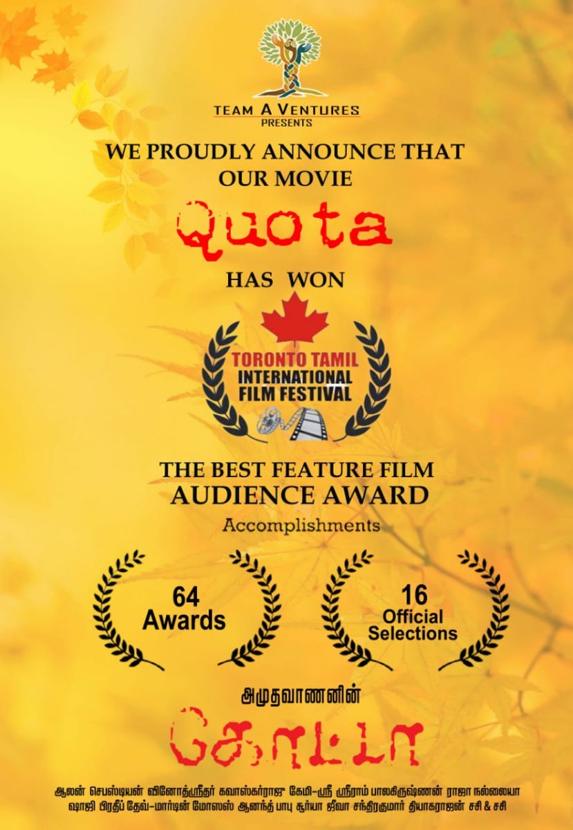 அத்துடன் கோட்டா திரைப்படத்தின் பயணம் நின்று விடவில்லை. இன்றைய தேதி வரை சுமார் 64 சர்வதேச விருதுகளை குவித்துள்ளது. இதன் பிறகும் இன்னும் பல விருதுகளை குவிக்கும் என்று படக்குழுவினர் நம்பிக்கை தெரிவித்துள்ளனர்.